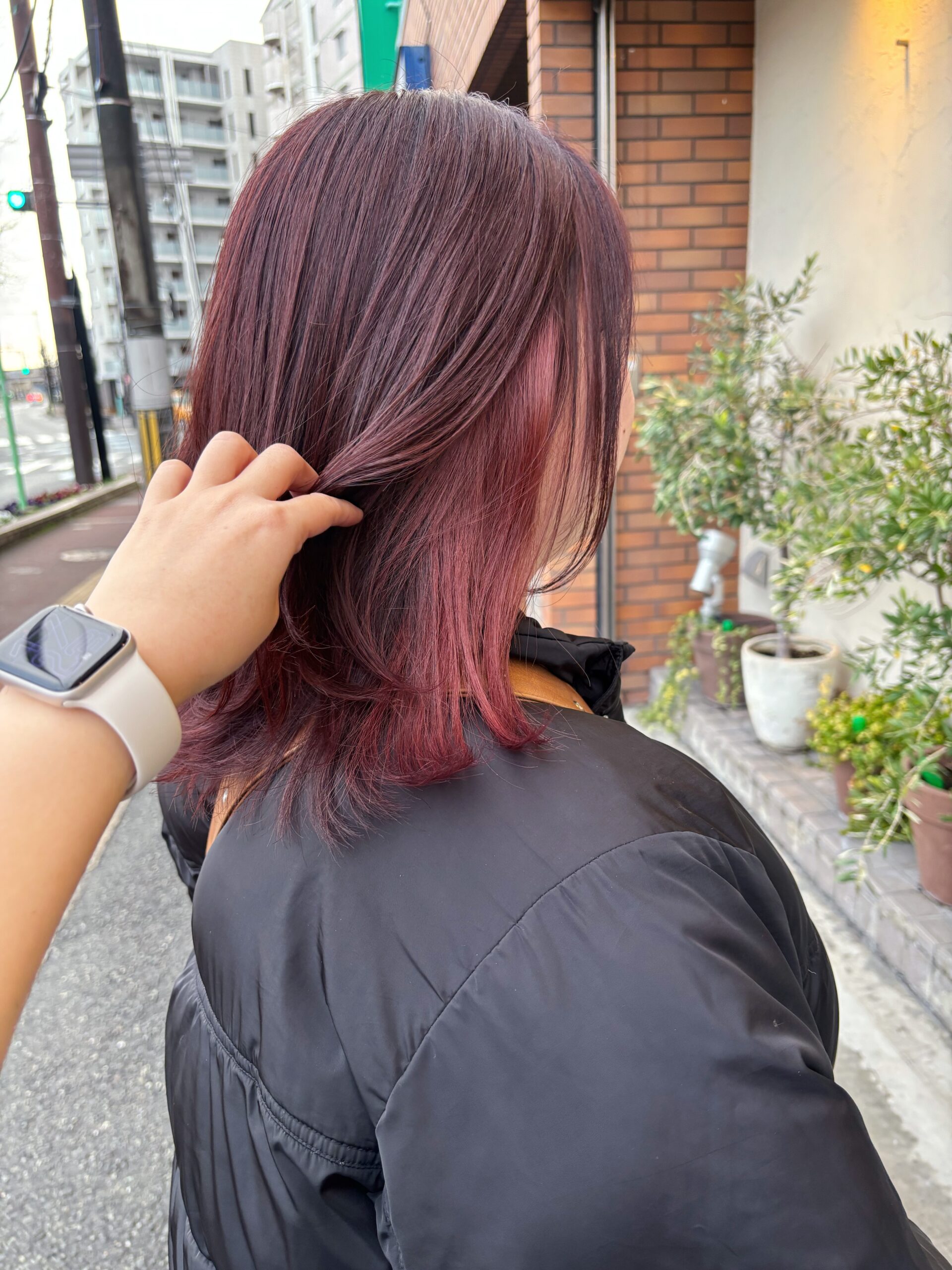 ブリーチをせずに、濃いめの赤系のカラーを入れさせていただき