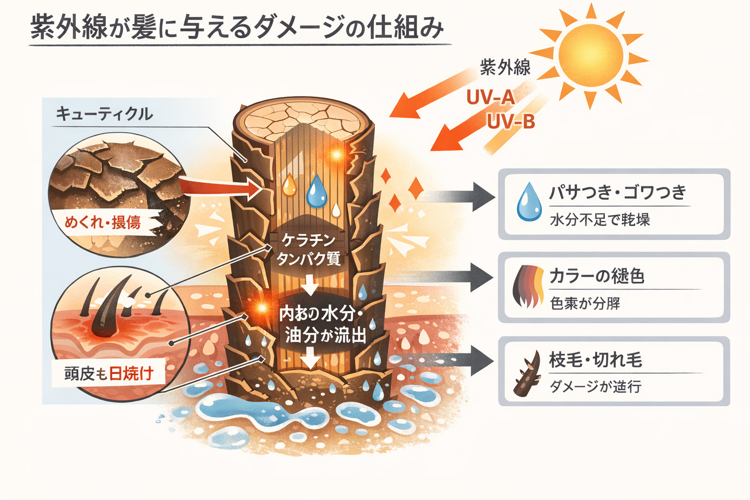 紫外線を浴びると、このキューティクルが浮き上がり、めくれたり欠けたりしてしまいます。